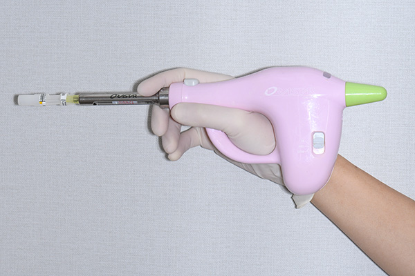 下の歯の奥歯や、麻酔が効きにくい部位では電動麻酔を使い、確実に痛みを感じなくさせてから治療を行っていきます。